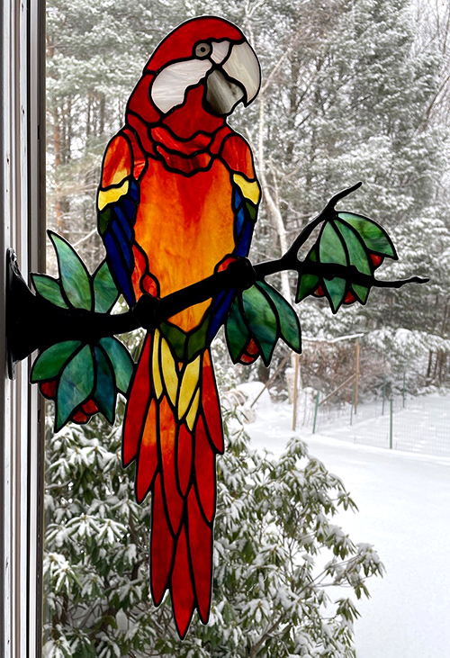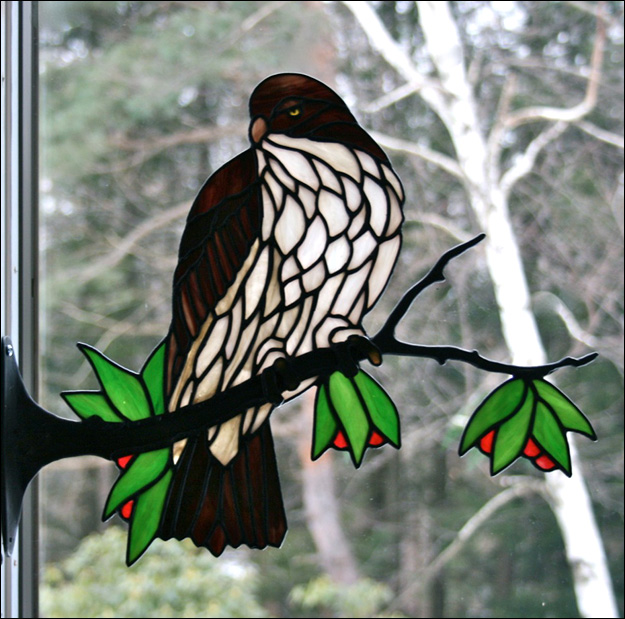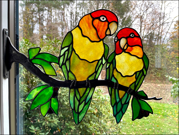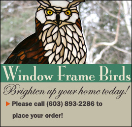 Branches can be mounted into the side of any window frame. Finished Birds on Branches are 13 1/2 to 14 1/2 inches wide. Finished Birds on Branches are for sale with kits available for the craftsperson (see side bar on right). Please call (603) 893-2286 to place your order. We accept Visa, Discover and MasterCard. Window Frame Birds make a unique and beautiful gift!