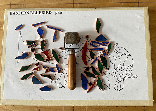 The large board partially off the edge of the table is sheetrock. Sheetrock, or wallboard it is perfectly flat and easy to cut to size. On the front left side of the work-board is a small wood block that has been screwed into the work-board from underneath. A 3/16 hole has been drilled through the wood block for the 50/50 solder to feed through. Feeding the solder wire through the wood block stabilizes the solder wire when nipping off tiny amounts of solder for edge beading. You must have experienced a roll of solder continually tipping over when you try to nip of small bits of solder from an almost depleted roll, the wood block solves that problem. With my pliers I pull through five or six inches at a time, always refluxing the newly drawn out length of solder.