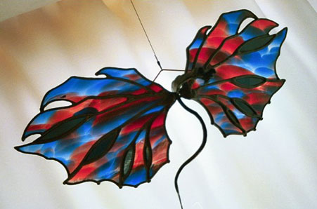 made of pewter, which is a metal that you can easily solder the stained glass wings into.